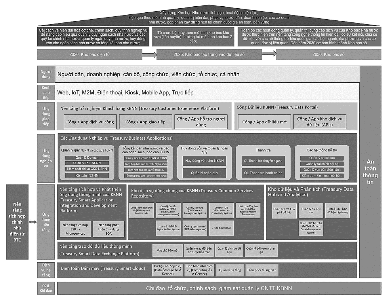 Kiến trúc tổng thể CNTT hướng tới Kho bạc số bao gồm:Kiến trúc nghiệp vụ; kiến trúc dữ liệu; kiến trúc ứng dụng; kiến trúc Kỹ thuật – Công nghệ; kiến trúc an toàn thông tin.
