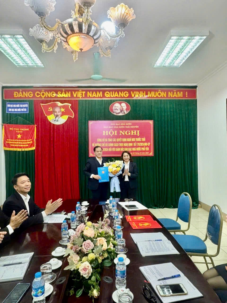 Ngày 03 và 04/3/2025, tại Cơ quan KBNN Thái Nguyên và các KBNN trực thuộc, KBNN Thái Nguyên tổ chức Hội nghị công bố và trao các Quyết định nghỉ hưu trước tuổi để hưởng chế độ bảo hiểm xã hội theo Nghị định 178/2024/NĐ-CP của Chính phủ đối với 06 công chức lãnh đạo gồm: Đồng chí Mai Thị Thu Hằng - Trưởng phòng Kiểm soát chi, đồng chí Nguyễn Đức Tình - Giám đốc KBNN Phổ Yên, đồng chí Nguyễn Văn Cường - Giám đốc KBNN Phú Bình, đồng chí Nguyễn Văn Dũng - Giám đốc KBNN Sông Công, đồng chí Lê Thị Minh Huệ - Phó Trưởng phòng Kế toán Nhà nước và đồng chí Ma Đình Văn - Phó Giám đốc KBNN Định Hóa kể từ ngày 01/3/2025.